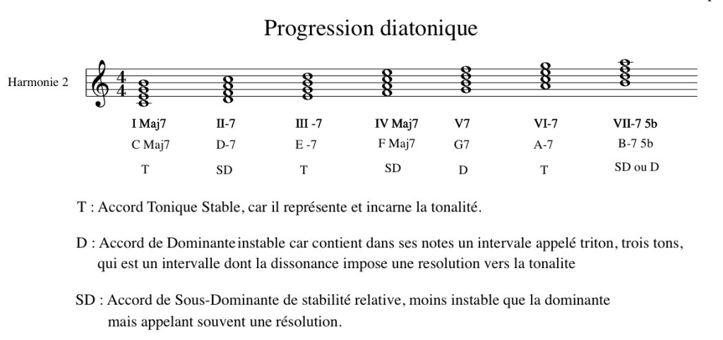 La première progression d’accords que nous allons étudier est la progression diatonique à la gamme majeure. Elle reste bien sûr identique dans toutes les tonalités.