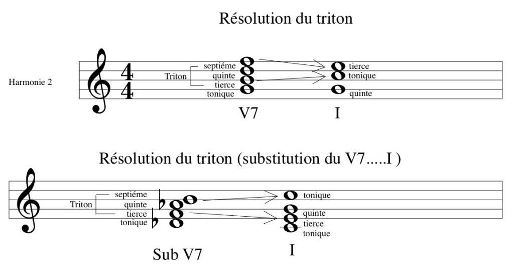 L’accord de dominante au 5ᵉ degré possède un intervalle caractéristique entre sa tierce et sa septième, appelé triton. Cet intervalle se résout vers l’accord de 1ᵉʳ degré par un mouvement conjoint de demi-ton et par mouvements contraires.