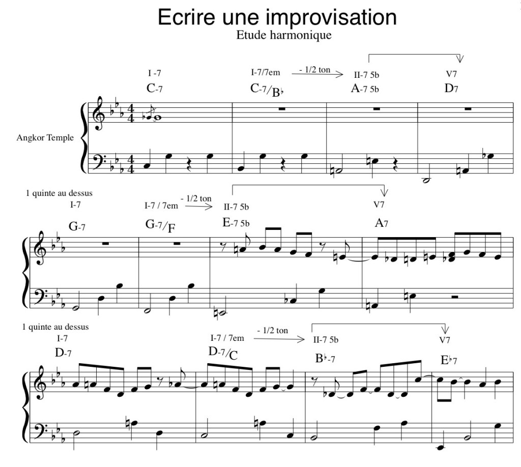 La grille de ce morceau peut s’analyser comme une succession de deux parties de 28 mesures chacune, la seconde étant une variation du thème menant vers une conclusion. Pour l’improvisation, on retient donc une grille de 28 mesures, sur laquelle on créera, pour chaque section, une atmosphère particulière inspirée de la description du temple d’Angkor.