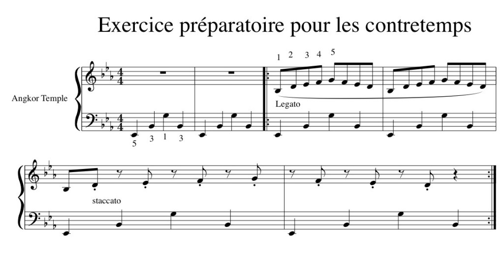 - Il serait intéressant de réaliser un exercice préparatoire pour s’habituer à placer les notes en syncope par rapport au temps, notamment entre les phrases longues en legato.