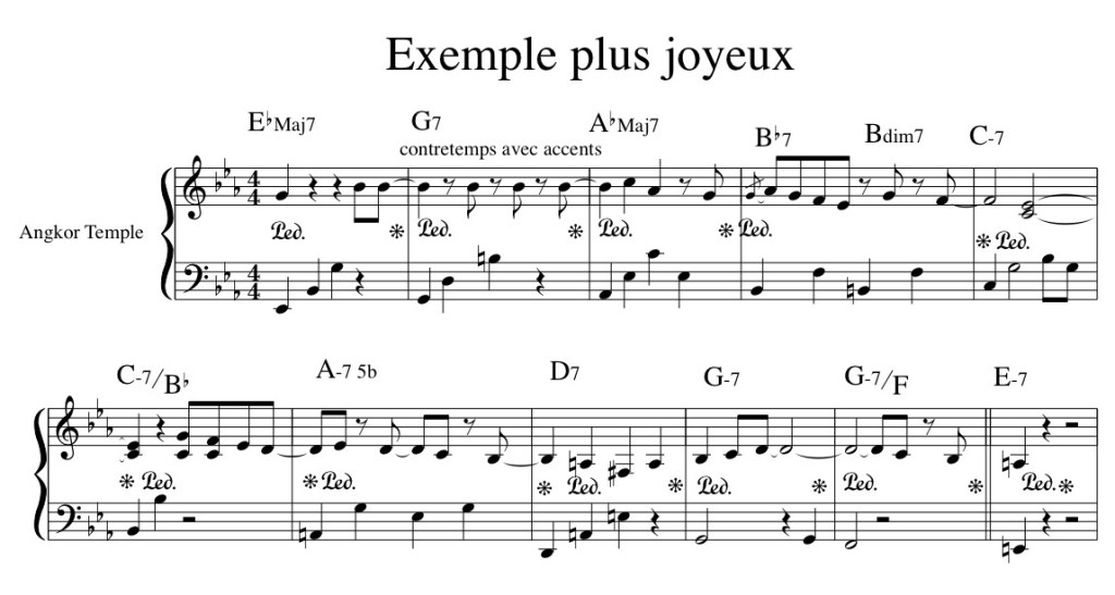 Les phrases décalées dans l’espace de la mesure, avec des notes en contretemps et des accords basés sur les extensions, donneront une couleur plus moderne.