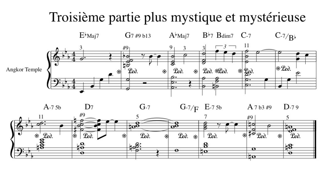 Cette troisième partie pourrait être interprétée plus lentement, voire en rubato, afin d’accentuer l’effet de mystère. On pourrait également enrichir l’harmonie avec des accords plus complexes et légèrement dissonants, en exploitant les extensions naturelles des accords.