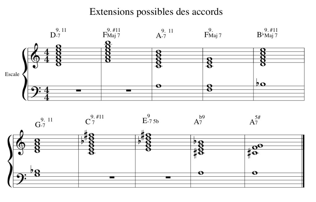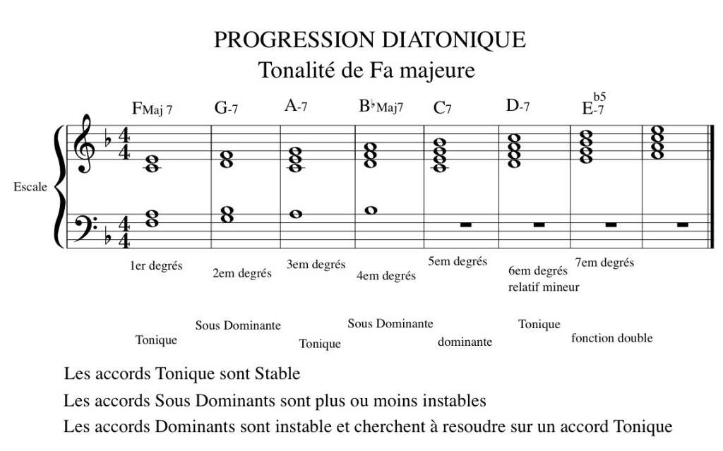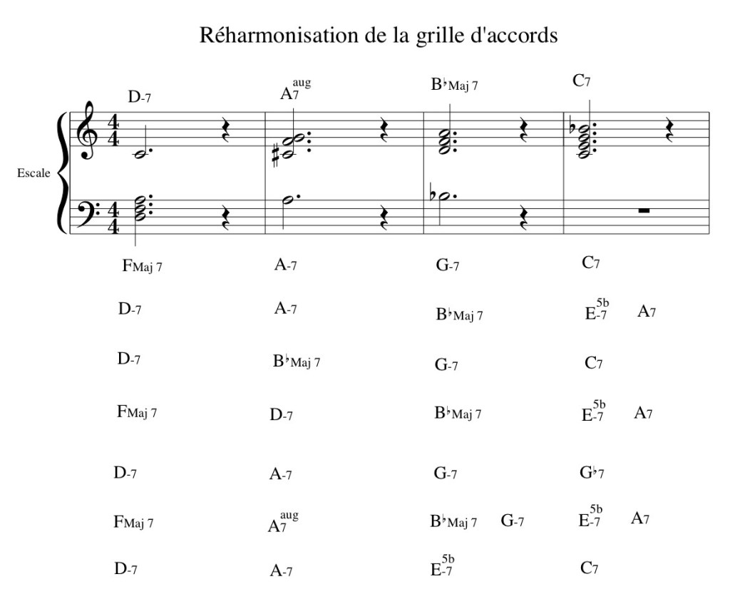 L’ensemble de ces accords appartient à la progression diatonique de Fa majeur. La gamme sur laquelle il sera possible d’improviser sur l’ensemble de ces réharmonisations sera donc, elle aussi, Fa majeur, en tenant compte des exceptions, comme c’est le cas pour l’accord Sol♭7.