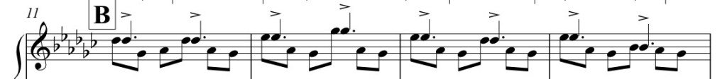 Beaucoup de phrases peuvent avoir les effets de nuance, il serait intéressant de faire des exercices pour comparer les options possibles. La notion de nuance intègre aussi la notion de dynamique et d’accent, certaines notes peuvent être accentuées et une section entière peut avoir une dynamique plus forte ou plus faible. Notez bien les accents de la mélodie dans la section B.