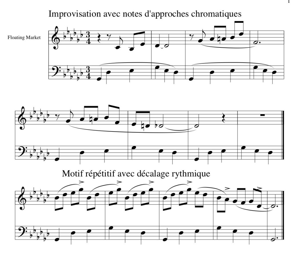Les phrases comportant des approches chromatiques ou des décalages dans la mesure apporteront des couleurs plus proches du jazz.