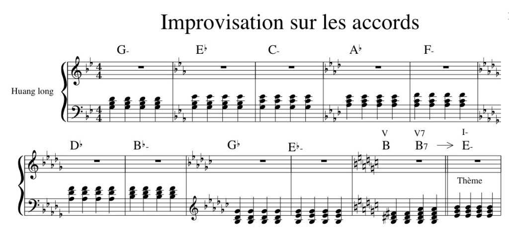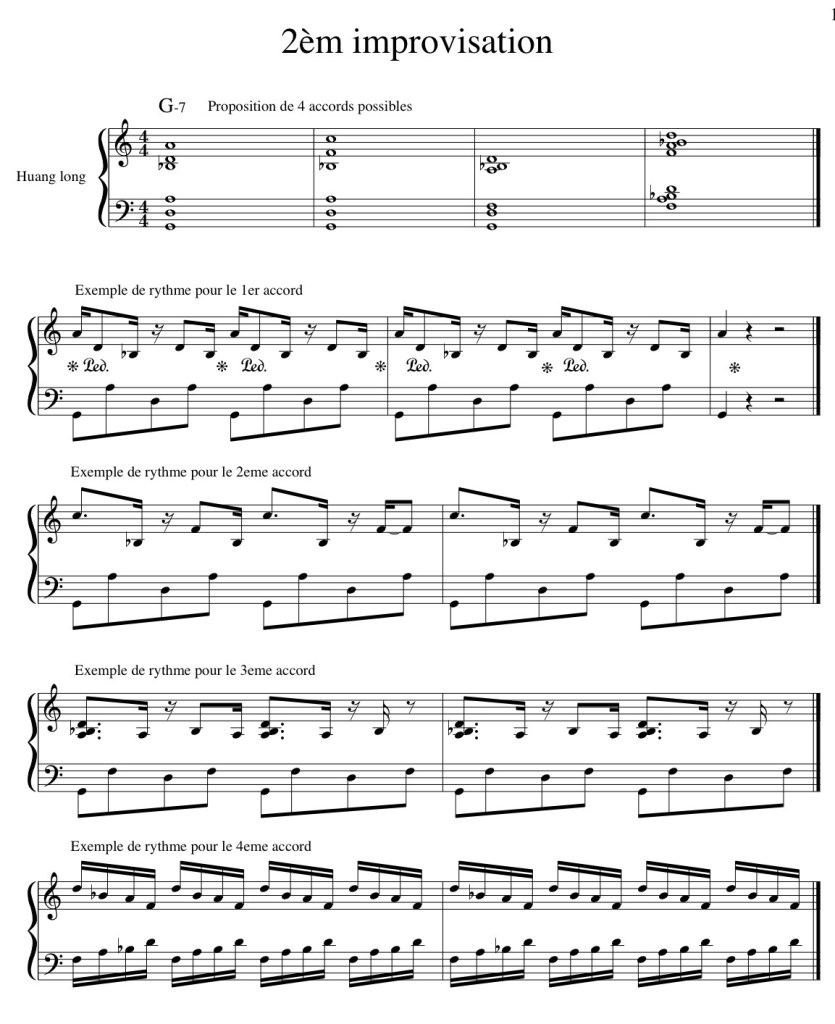 - Ensuite vient une seconde improvisation sur les mêmes accords que la première, mais il faut interpréter cette improvisation de manière différente, en élargissant au maximum la distance de réalisation des accords entre la main droite et la main gauche, puis trouver une rythmique entre chaque main pour faire danser l’ensemble.« La description de la méthode pour les improvisations se fera dans le chapitre Improvisation »