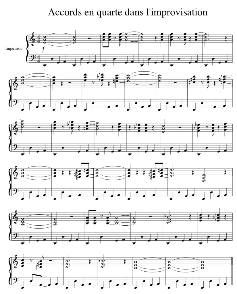 Ces empilements de quartes, très utilisés par des pianistes comme McCoy Tyner ou Herbie Hancock, apportent une couleur résolument moderne et une grande liberté d’improvisation. Ils s’intègrent parfaitement à un accompagnement modal et permettent de souligner la tonalité tout en gardant une ambiance ouverte et contemplative. Les rythmes en syncopes accentueront l’effet.