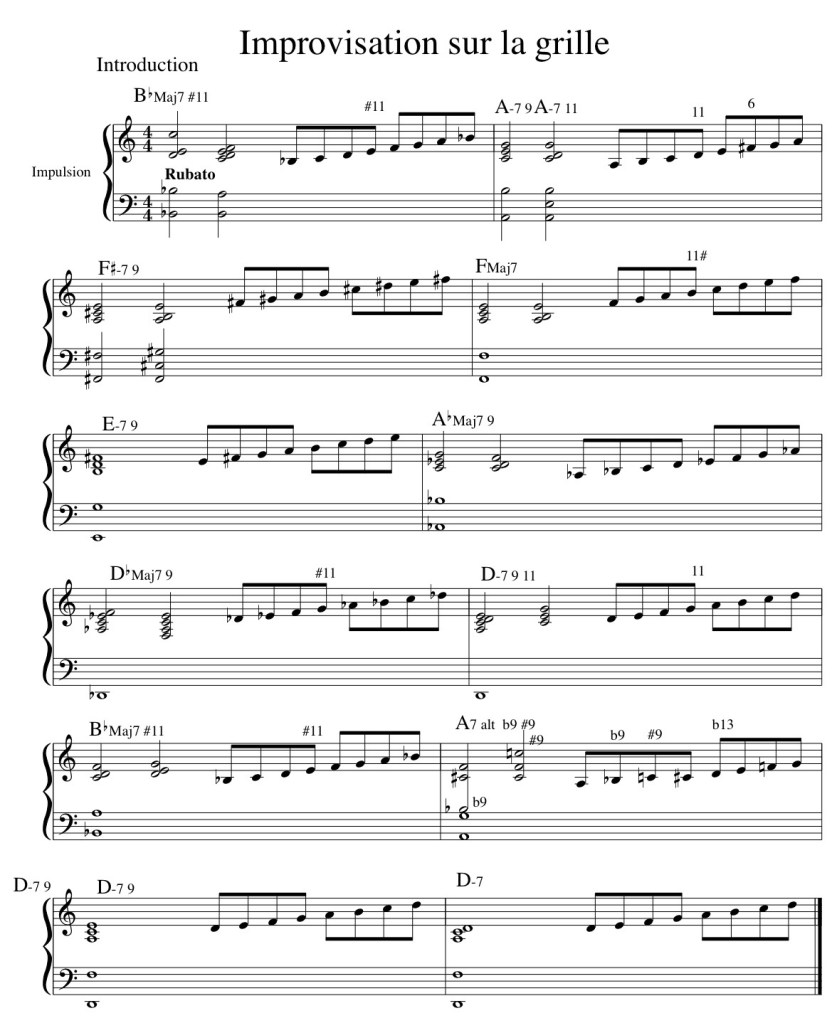 L’idée est de créer une impression d’imprévisibilité, chaque note, chaque silence, chaque changement de dynamique ou de rythme participe à cette sensation de mouvement. Les possibilités sont infinies, mais c’est cette diversité même qui donne vie à une improvisation entre ordre et chaos.
