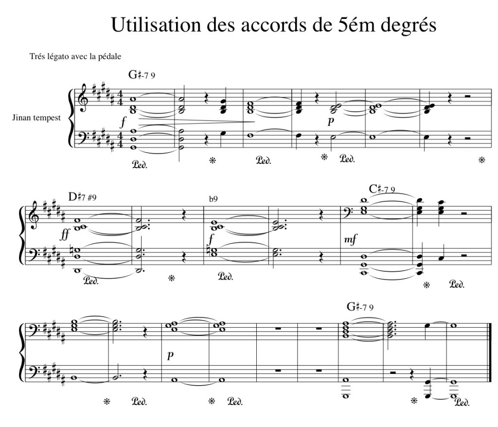 Ces accords de dominante, avec leurs notes altérées, apportent une couleur plus tendue et inattendue, idéale pour évoquer les soubresauts d’une tempête musicale.