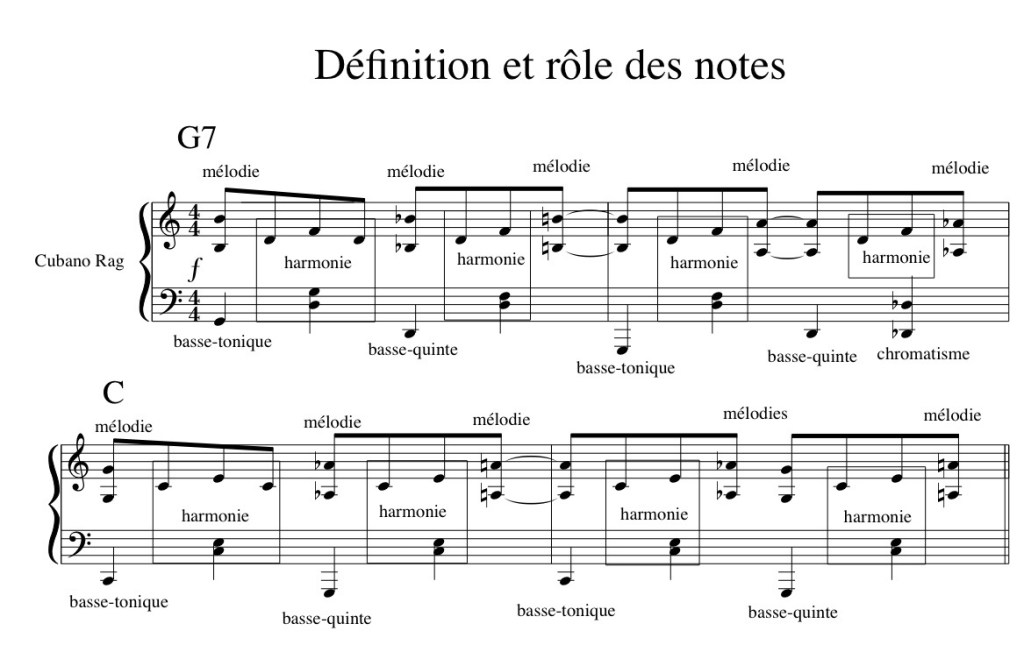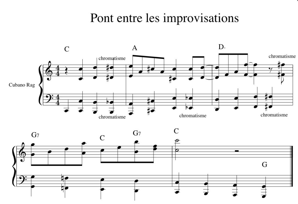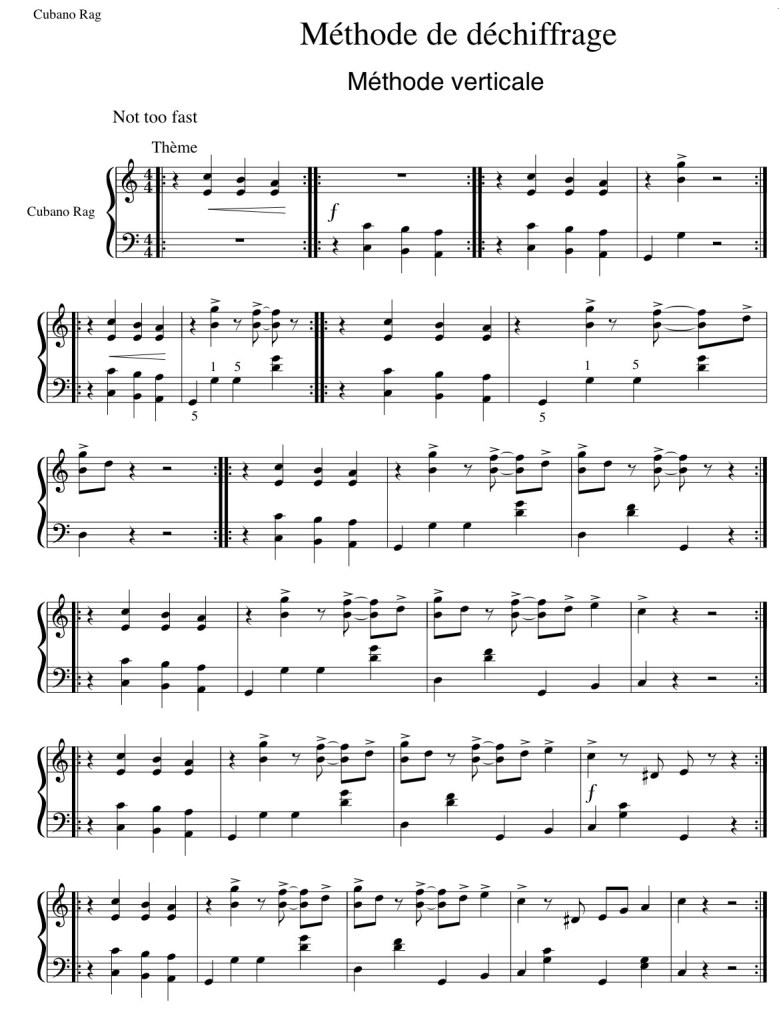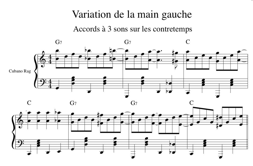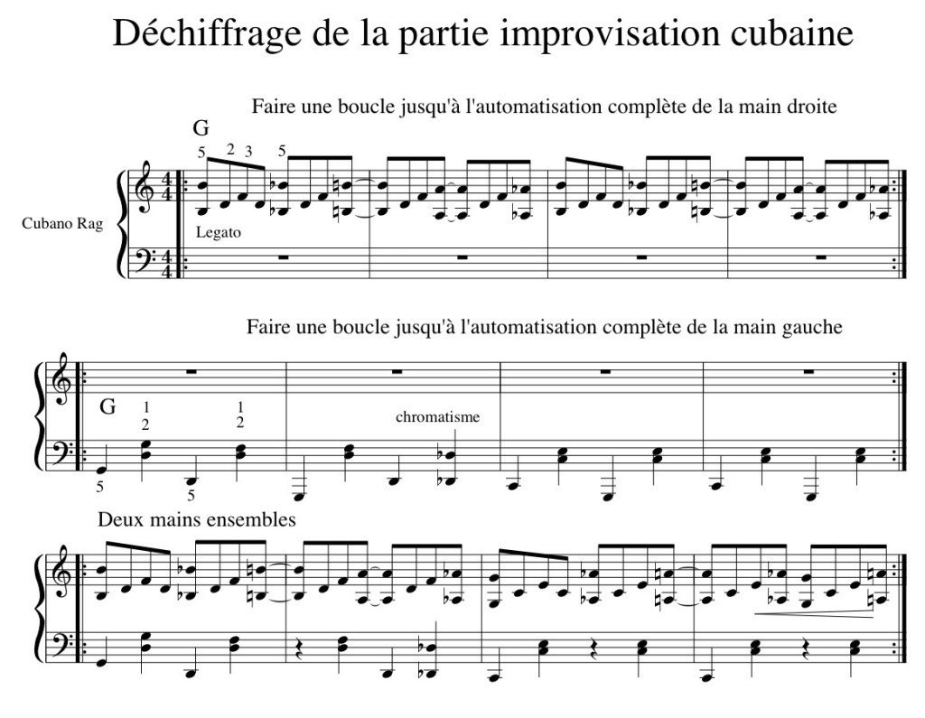 Des exercices préparatoires seront réalisés pour s’habituer à placer les rythmes caractéristiques de la main gauche, typiques du ragtime, ainsi que ceux de la main droite, inspirés du style cubain.