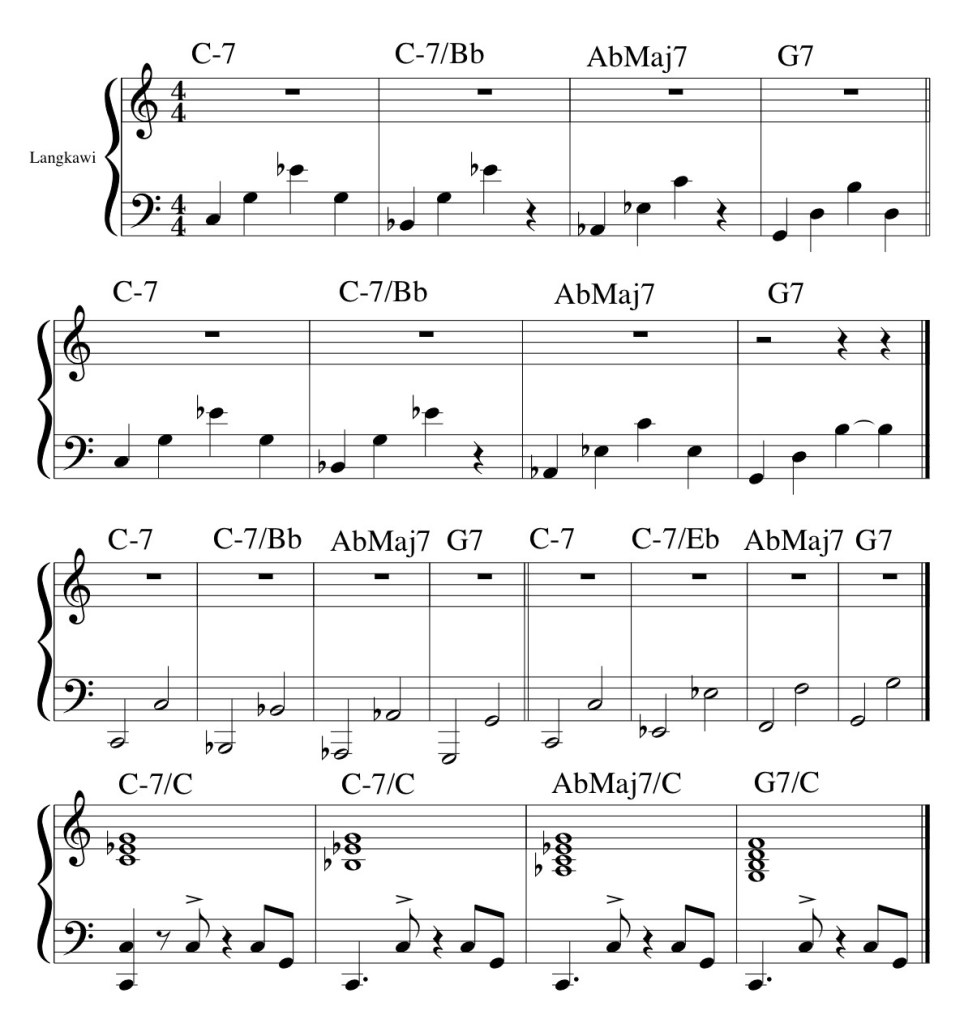 Langkawi est une petite île en Malaisie. L’image de plages calmes et de couchers de soleil pourrait être celle que l’on tente de représenter dans l’interprétation de ce morceau. De nombreuses phrases peuvent être nuancées, et il serait intéressant de faire des exercices pour comparer les options possibles tout en gardant cette idée de calme et de sérénité.
