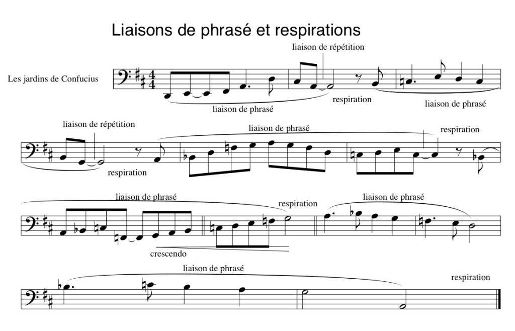 La notion de phrase dans l’écriture d’une mélodie est représentée par une liaison qui part du début de la phrase et se poursuit jusqu’à la fin. Une intention de coupure ou de respiration entre les phrases doit être perceptible. (Ne pas confondre avec la liaison de répétition entre deux notes identiques, qui indique que la seconde note ne doit pas être répétée.)