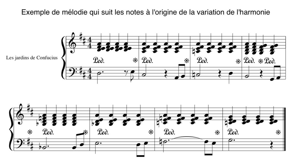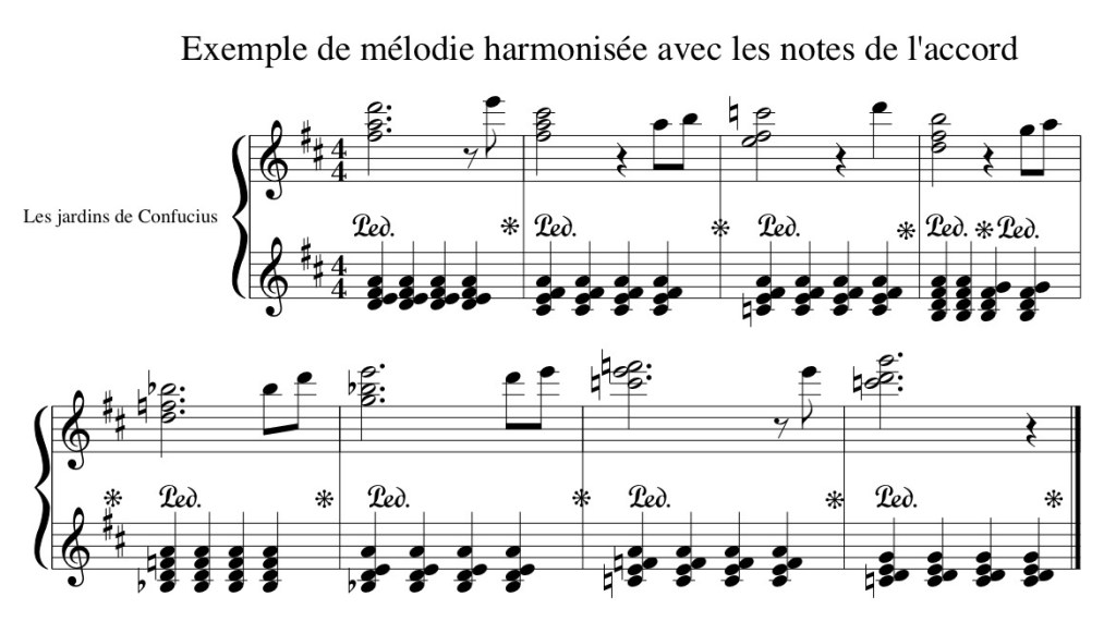 Il est possible de jouer les mélodies à l’octave pour leur donner plus de présence, ou de jouer des mélodies harmonisées avec les notes de l’accord d’accompagnement.
