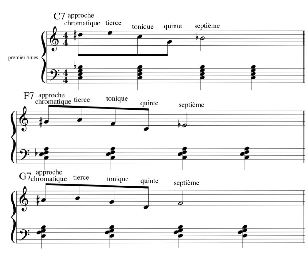 La notion d’improvisation dans un blues de style jazz consiste à viser les notes de l’accord en utilisant des approches chromatiques. Cela peut se faire sous forme de mélodies ou d’arpèges d’accords, en croches ou en triolets.