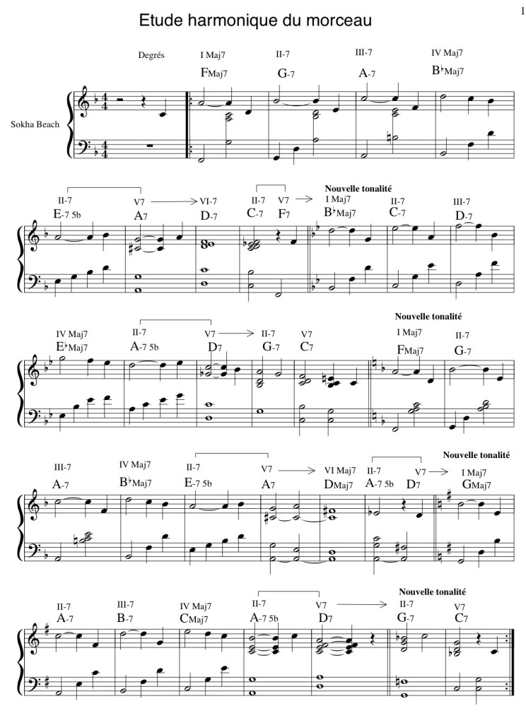La tonalité du morceau, représentée par une bémols à la clé, correspond soit à la tonalité de Fa majeur, soit à son relatif mineur, Re mineur. En regardant à la fin du morceau, on s’aperçoit que le dernier accord est Fa Majeur, ce qui définit la tonalité générale du morceau.