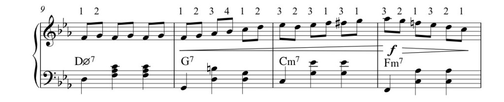 Beaucoup de phrases peuvent avoir les effets de nuance, il serait intéressant de faire des exercices pour comparer les options possibles. La notion de nuance intègre aussi la notion de dynamique et d’accent, certaines notes peuvent être accentuées et une section entière peut avoir une dynamique plus forte ou plus faible. Notez bien le crescendo entre la mesure 10 et 13.
