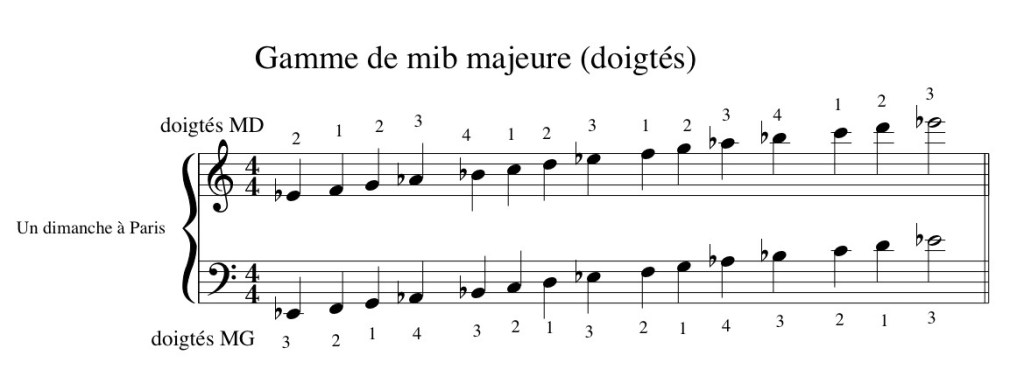 - Commencez par identifier les 3 bémols inscrites à la clé (sib, mib, lab) pour les visualiser sur le clavier du piano. Concluez que vous jouerez les notes de la gamme de mib, la travailler avec les doigtés suivants: